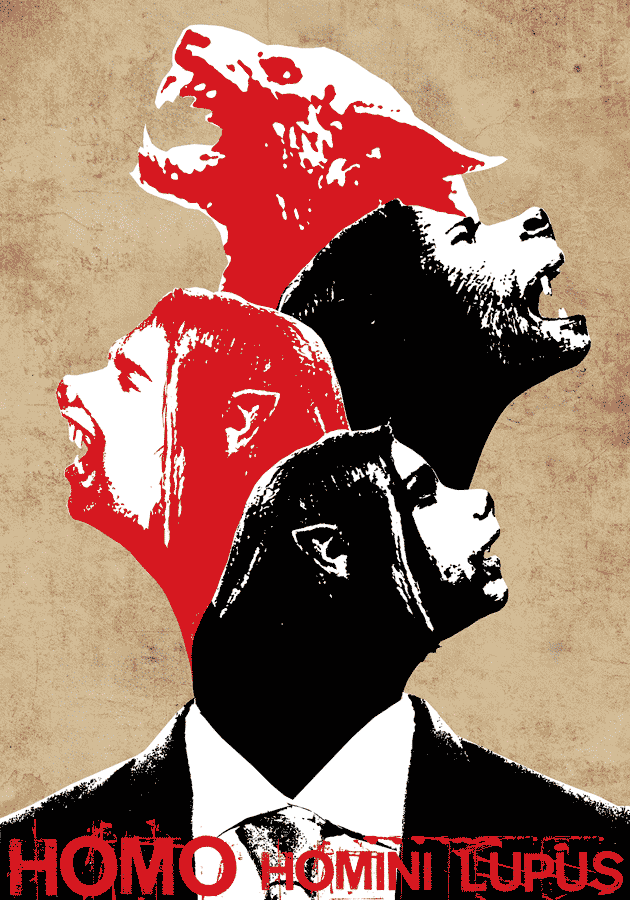 “Homo homini lupus” is a Latin phrase meaning “man is a wolf to another man”